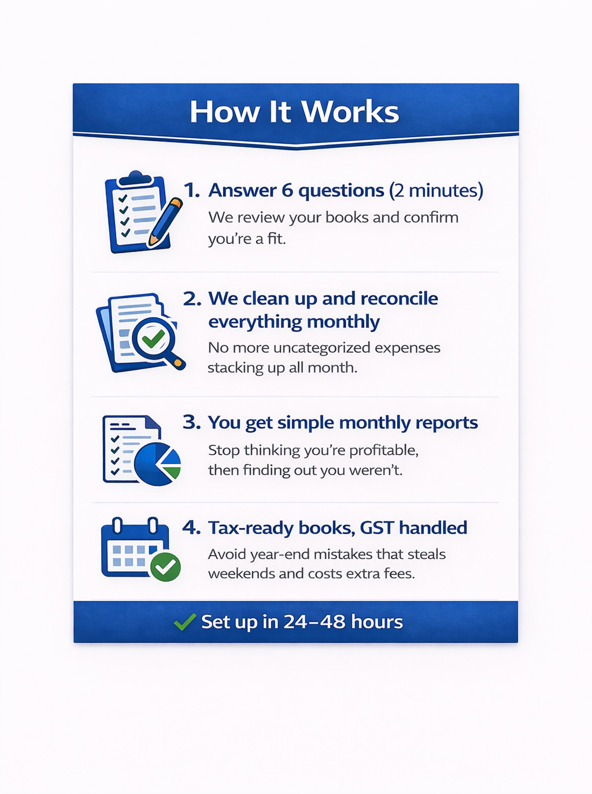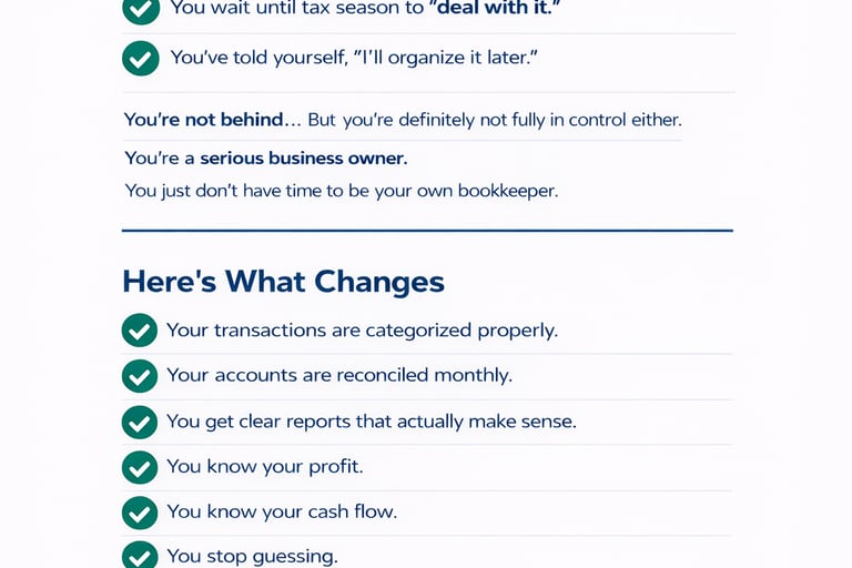 Every month you wait, you risk missed write-offs, cash leaks, late fees, and ugly surprises when tax season hits.