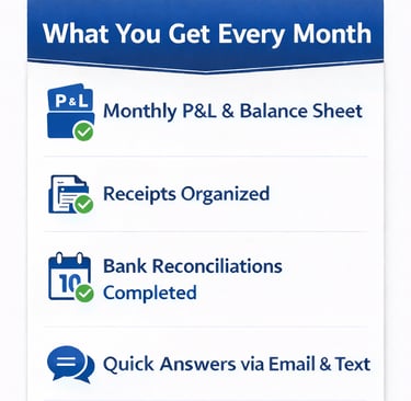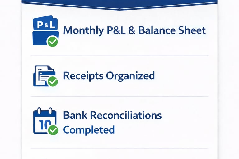 Bank and Credit Card Reconciliation: Ensure the accuracy of your financials with monthly reconciliations.